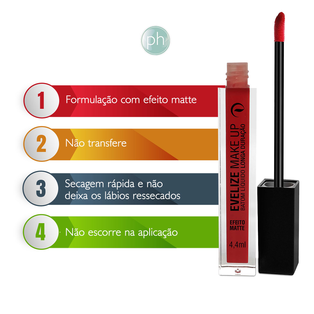 O Batom Líquido Evelize Make Up possui uma formulação com efeito matte, toque aveludado e longa duração além de ser vegana. A cobertura perfeita das cores não transfere, não escorre na aplicação, tem secagem rápida e não deixa os lábios ressecados.